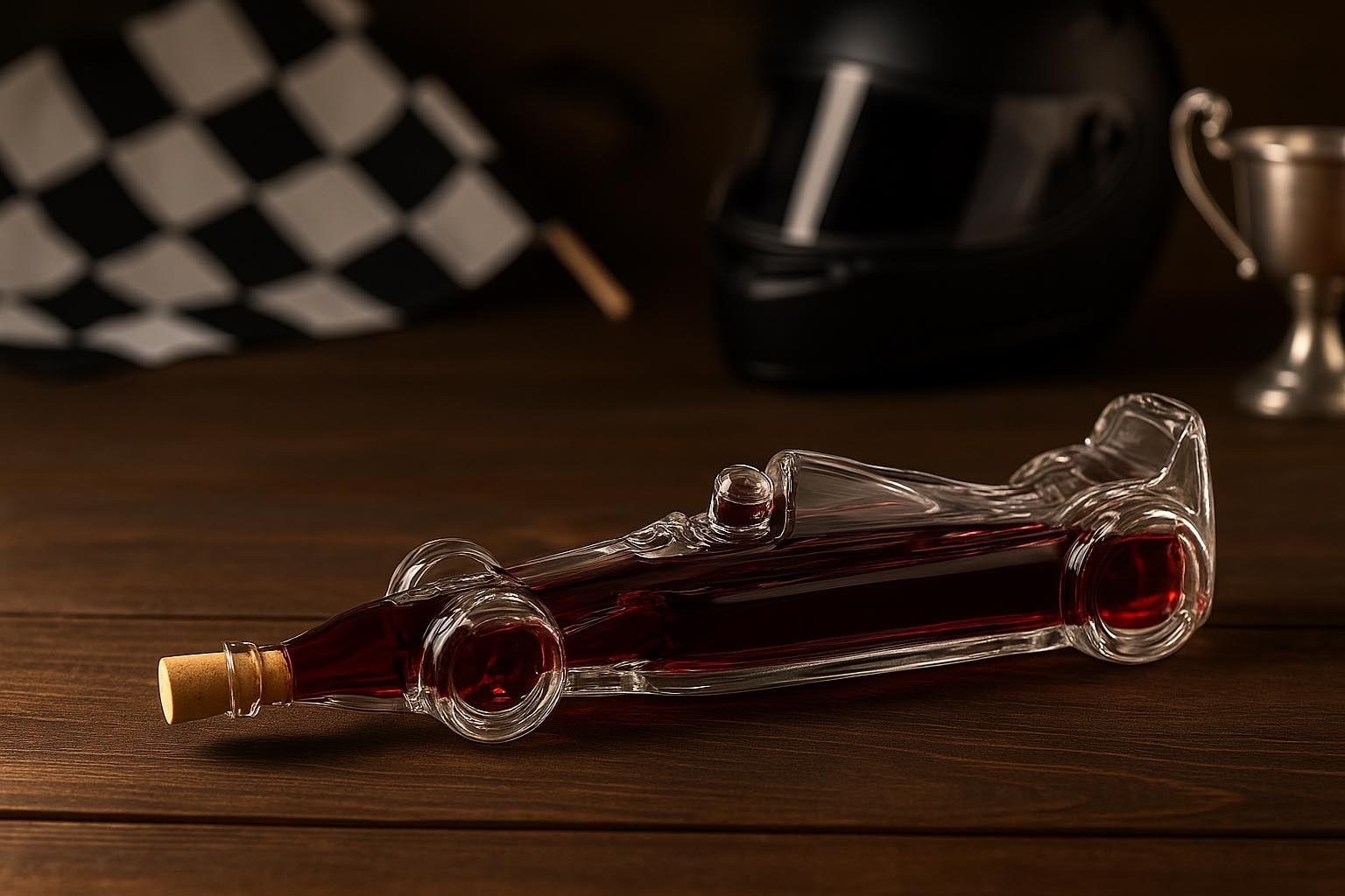 Бутилката с мотив „Състезателна кола“ е изключителна атракция за феновете на моторните спортове и любителите на стилни бутилки. Нейната детайлна форма улавя динамиката и елегантността на класическа състезателна кола перфектно и я прави идеален избор за специални спиртни напитки, ракии или ликьори. Изработена от висококачествено прозрачно стъкло, тя съчетава запомнящ се дизайн с първокласна изработка. Корковото гърло осигурява стилно запечатване и придава на бутилката изискано излъчване. Независимо дали като подарък за ентусиасти на моторните спортове или като ексклузивна колекционерска бутилка – бутилката „Състезателна кола“ представя всяка напитка със скорост и стил.