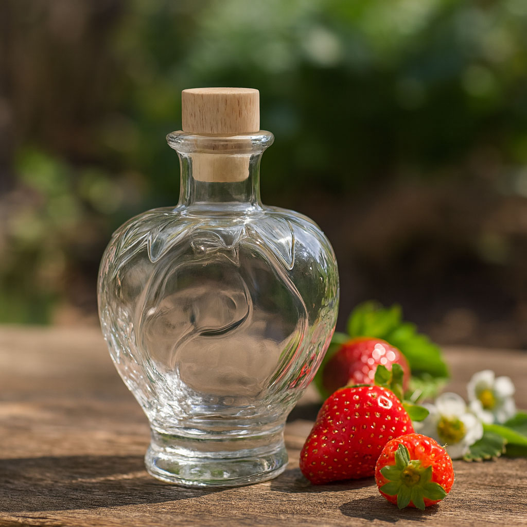 Бутилката с мотив „Ягода“ впечатлява с чаровния си, детайлно изработен дизайн и носи сладостта и свежестта на популярния летен плод в елегантна стъклена форма. Изработена от висококачествено прозрачно стъкло, тя е идеална за фини спиртни напитки, плодови брендита или изискани ликьори. Хармонично структурираният ѝ повърхност напомня на естествената текстура на ягодата и прави бутилката истински акцент. Благодарение на корковото гърло съдържанието може да се затваря сигурно и стилно.