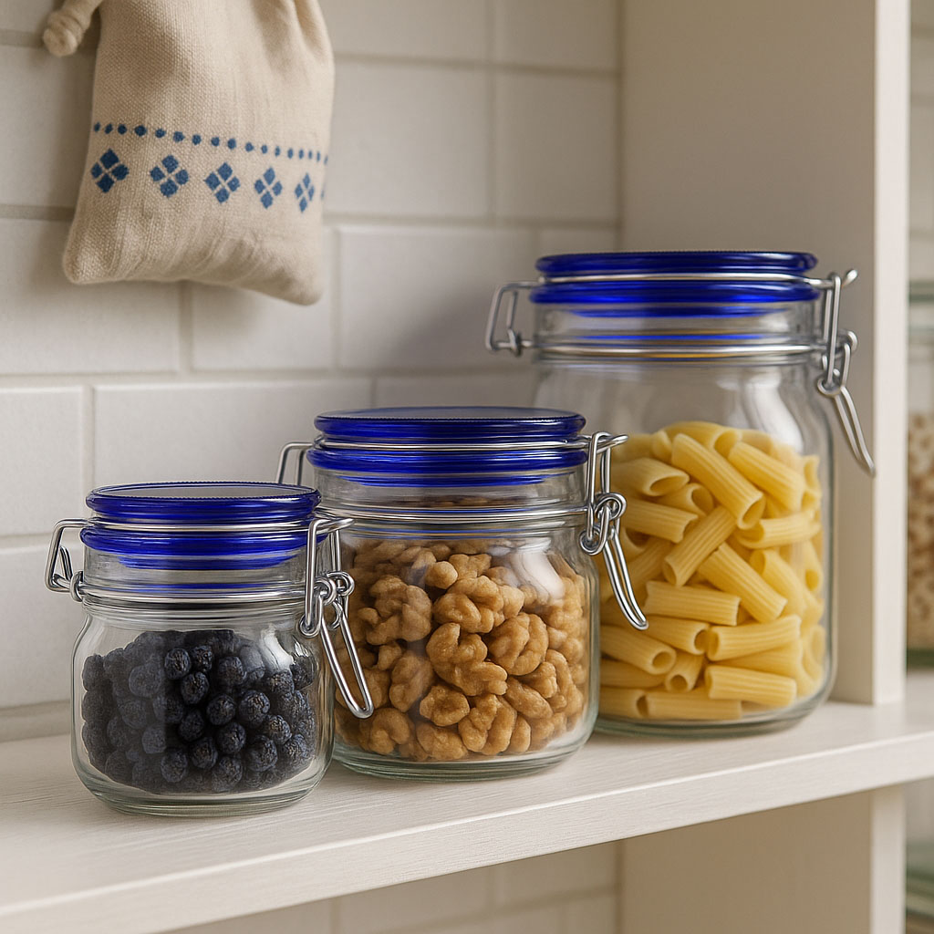 Серията „Fido Blue Top“ съчетава доказана функционалност с модерен дизайнерски акцент. Произведени от италианската традиционна компания Bormioli Rocco, тези висококачествени стъклени буркани с телена скоба впечатляват с квадратната си основа и елегантния син стъклен капак, който им придава естетически вид. Налични в обеми от 500 до 2000 мл, „Fido Blue Top“ предлага многофункционални възможности – от консервиране на домашни специалитети до стилно съхранение на запаси. Придружаващата телена скоба, в комбинация със стъкления капак и гуменото уплътнение, осигурява херметично затваряне.